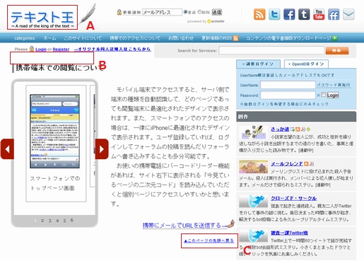 - ロゴ[A]は左上か真ん中で、ホームへのリンクが張られている