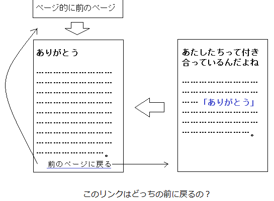 ところがそのリンクを使うと、飛べるけど戻れない、のだ。ブラウザには必ずある「戻る」が存在しない。マウスジェスチャなんて言わずもがなである。じゃあ、飛んだ用語のページに「前のページへ戻る」というリンクを入れようかという話が出た。だが最初から順序よく読んできた人が目にしたら戸惑うことは明白である。その人にとっての前のページは文字通り、一つ前のページだからだ。