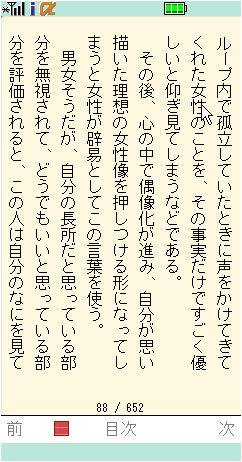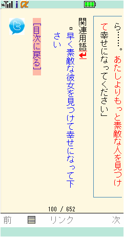 もし、電子書籍が成熟して、ガイド的な意味を持つリンクにそれぞれシンボリックなアイコンが存在するようになったら(たとえば、ウェブサイドであれば家のアイコンはホームへのリンクであるように)、携帯の狭い画面であっても多様なリンクをデザインを崩さずに配置することが可能だろう。だが現状では存在しないので、リンクを付けるならすべて文字で付けるしかない。意味が重なれば、