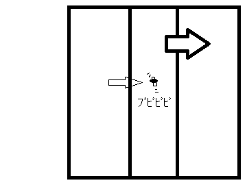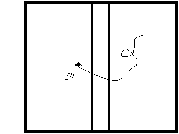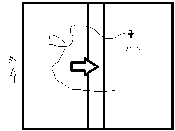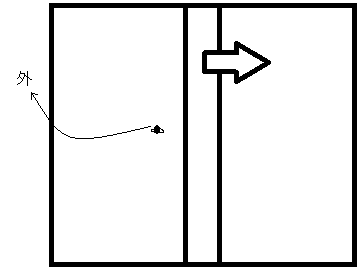 4.叩くものを持っていないので、とにかく細い矢印の動きでハエに外へ飛んでいってもらいたい一心で手で追い払いながら更に戸を引く。
