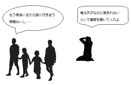 ところがクリエイター志向の中年は、やりたいことを突き詰めていく途中で、友人、同じ志を持つ仲間、恋人を失っている、あるいは彼らから距離を置かれていることが多く、手を差し伸べてくれる人がいないので、一度、正気を失ってしまうと深刻である。正気を失っている頃は、そういった自分を見られたくないという意識が働き、孤独はむしろ歓迎となることが多いが、時間が経過して、正気を取り戻せるかもしれないとなったときに引っ張り上げてくれる人がいないと、今度は改めて認識した孤独感によって生じる不安に押し潰されてしまうことになる。